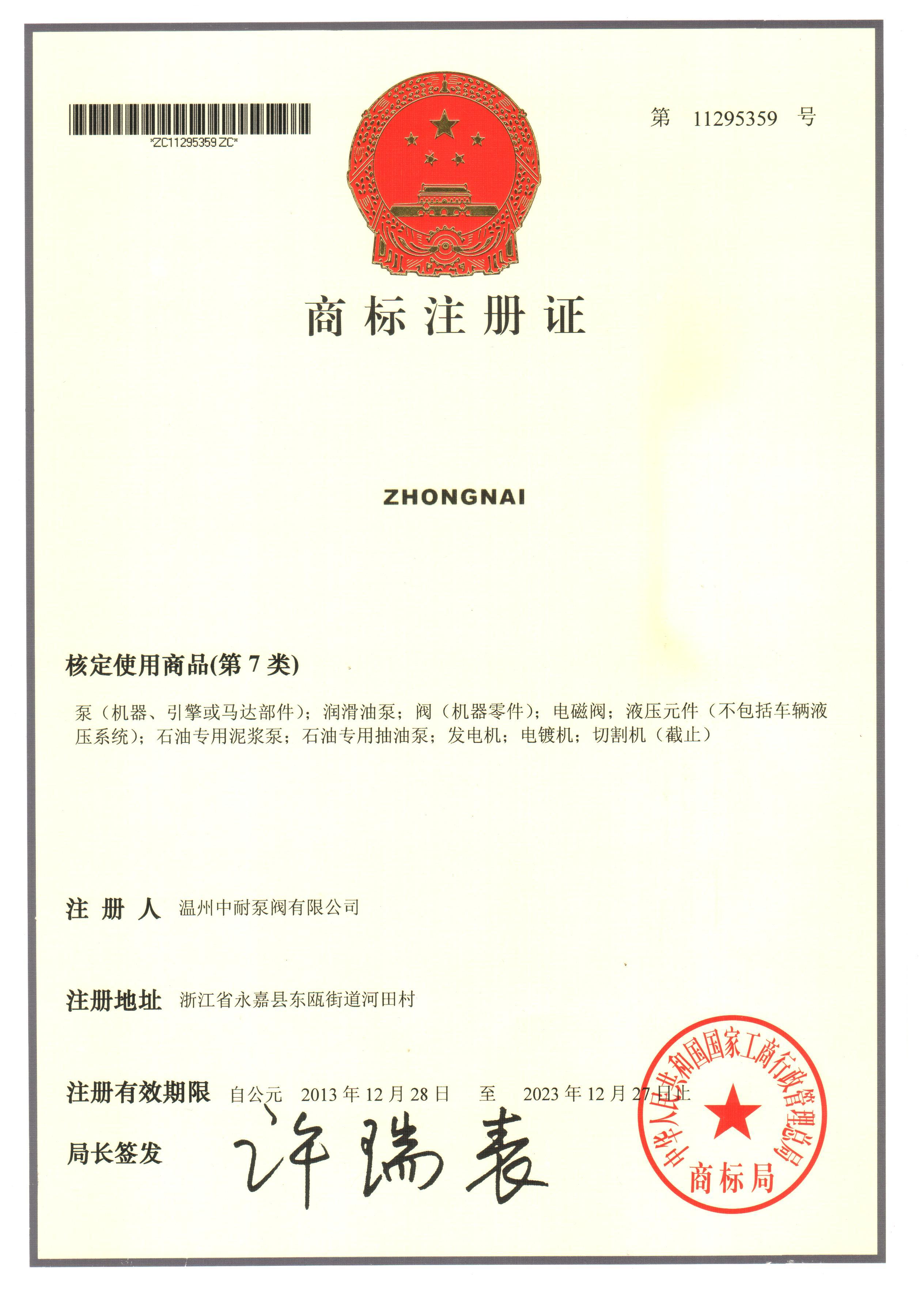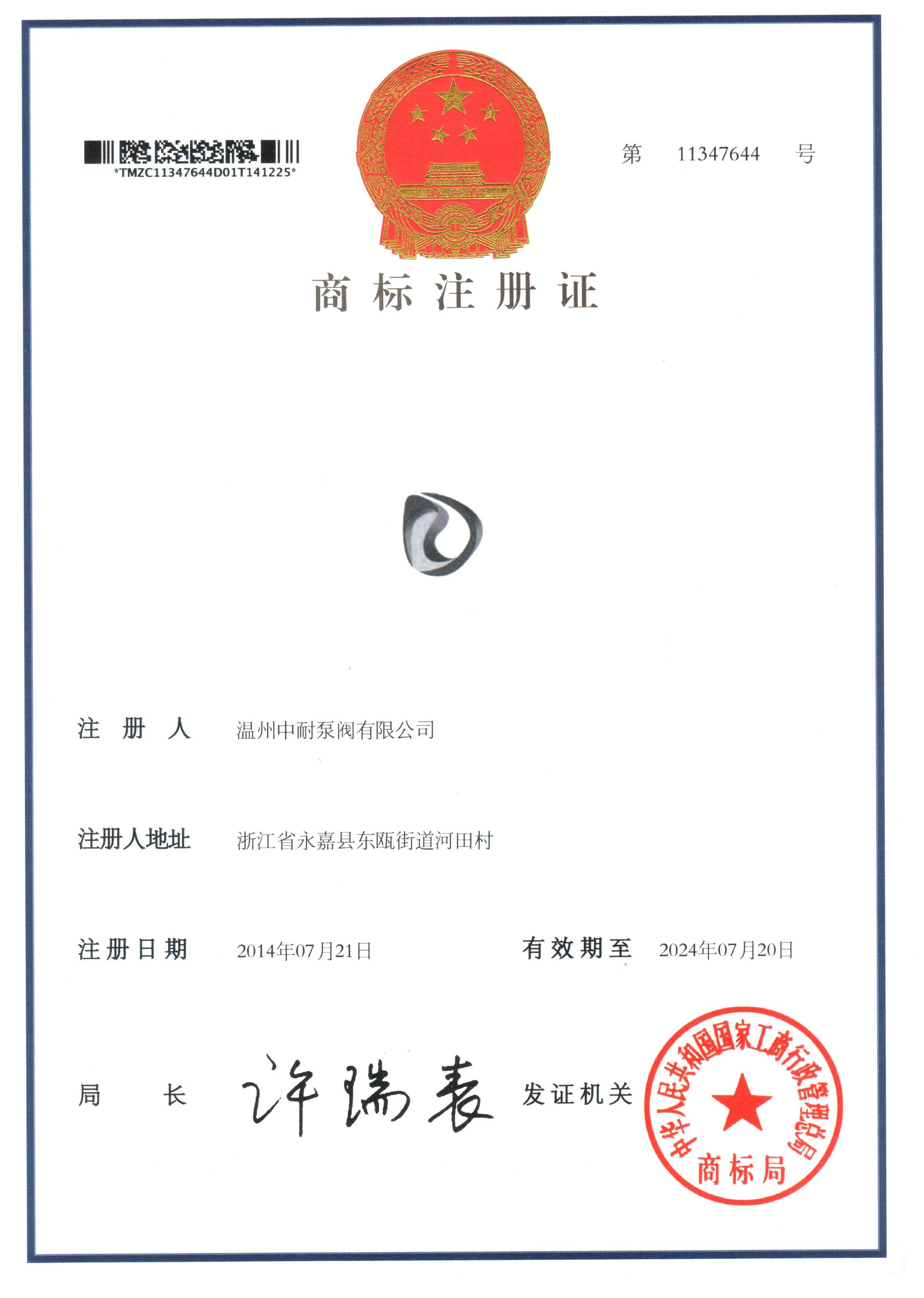 《商标注册证》是商标局依照《商标法》的有关规定,颁发给商标注册人以证明其商标专用权范围的法律文书。中耐公司于2012年6月开始申请注册商标,于2014年7月21日全部正式获得注册成功,“中耐”品牌正逐渐强大,以品质铸造品牌,相信在不就的将来,“中耐”必将成为国内、外知名品牌!